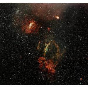 Rhw Bubble nebula at upper left is where a very hot star has expelled its outer envelope of gas leaving the interior to continue furious fusion of leftover nuclear fuel. The stars that do this type of process are calledWolf Rayet stars and it is the bright star in that bubble object. This region is also noted for the Lobster Claw nebula below at center and below center. This is so named for its appearance to the claw of one of these crustaceans!