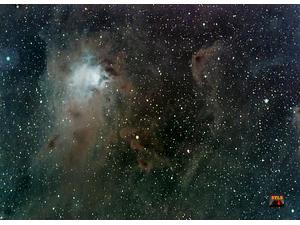 Never a more dusty place exists than here... Dark silicate and carbon particles swirl around a newly formed star in the middle of a dust cloud. The star's light in the blue part of its spectrum is scattered by the dust in the cloud giving it a markedly blue color. Our sky is blue due to a very similar process.
