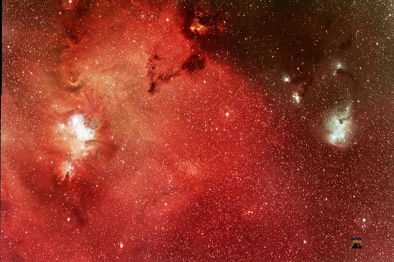 At left of center the beautiful blue of the Christmas tree cluster shines out from behind the Foxfur nebula surrounding it and down below the conical shaped Cone nebula draws the eye in to a massive several light year across dark cloud of dust that is fringed with glowing hydrogen gas. On the right, NGC2245 is another complex region of reflection (blue) nebulae and dark sinuous dust clouds.