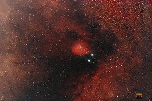 Tucked in a dark cloud, stars formed within and began to burn brightly, ionizing hydrogen gas in the cloud, making it visible. Thus a wonderful sight was born for all to see. This object is tiny actually but almost directly overhead in the Northern hemisphere in Summer around 9PM in Cygnus the Swan.