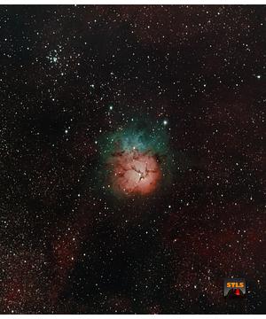 So named because of its three lobed appearance, this nebula is a combination of the two basic tyupes: a blue reflection nebula, where dust scatters the stars' blue light, and an emission nebula where hydrogen gas is excited to glow reddish from the ultraviolet light of nearby hot young stars. The 'lobes' are in fact dark dust lanes that run through the nebula and in FRONT of it giving the appearance that it is split three ways. In fact these lanes are somewhat between us and the bright nebula behind them.
