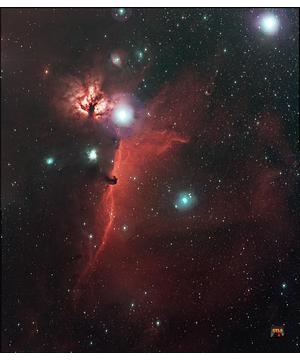 This location is several frames stitched together just below the hot young star Alnitak (above center slightly left), is a hydrogen emission region powered by the star right of center called Sigma Orionis. Sigma Orionis just right of center, excites hydrogen gas in the region to glow red silhouetting the dark dust feature we call the "horsehead". To the upper left of Alnitak is another gorgeous emission nebula known as the Flame Nebula. None of these are visible without a telescope or an exceedingly dark sky or both.
